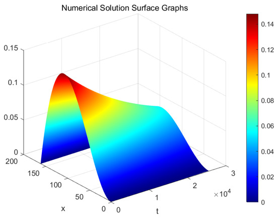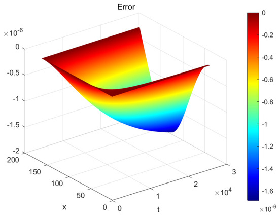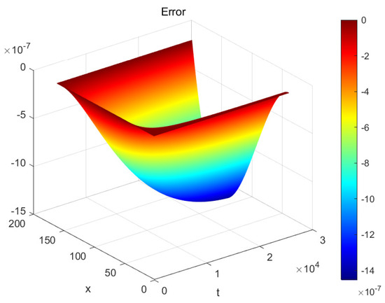 Figure 3 and Figure 4 present the three-dimensional error figures for the two schemes. Figure 5 and Figure 6, respectively, illustrate surface graphs representing the relationship between the numerical solution and the space–time axis for the two methods. Furthermore, Figure 3 and Figure 4 demonstrate that the error between the exact solution and the numerical solutions for both the POD reduced-dimension weighted explicit finite difference method and the weighted explicit finite difference method can reach when the space step size is , the time step size is , and . This observation is consistent with the numerical results presented in Table 1.