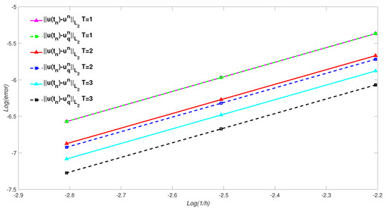 Therefore, based on the data presented in Table 1, Table 2, Table 3 and Table 4, the numerical errors are in line with theoretical expectations, regardless of the specific value chosen for within the tested range (). Moreover, these results highlight the proposed scheme’s capability to ensure sufficient accuracy while reducing degrees of freedom, saving CPU computation time, and enhancing computational efficiency. Additionally, Figure 7 visually presents a comparison of the errors between the two methods when , further illustrating the validity of the reduced-dimension method.