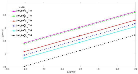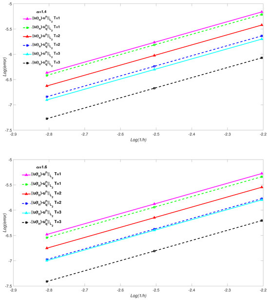 In Table 5, with a time step of and various space meshes of , , and , the orders of convergence for and are observed to be close to 2. The observed convergence is in line with theoretical projections. Additionally, we present the CPU running time results for both methods, corresponding to different values of , , and and for the final time T of 1, 2, and 3. The numerical results for the CPU running time confirm the effectiveness of the reduced-dimension weighted explicit finite difference method. Furthermore, Figure 8 provides a more intuitive comparison of the error estimates between the two methods under various conditions. Specifically, it illustrates the error estimates for different values of (1.4, 1.6, and 1.8) and final times T (1, 2, and 3).