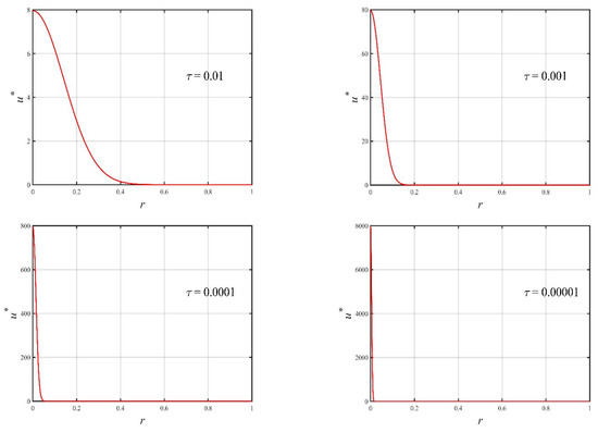 where u0(X, t0) is a regular function that can be calculated exactly by standard Gaussian quadrature. The influence of the time step size on the integral is evident from (4). As the time step τ approaches zero, the integrand tends to infinity, which consequently undermines the accuracy of calculating the integral I using standard Gaussian quadrature [22,23,29]. The variation of u* with respect to r for different time steps is depicted in Figure 1.
