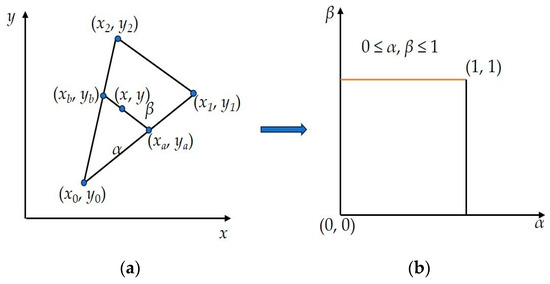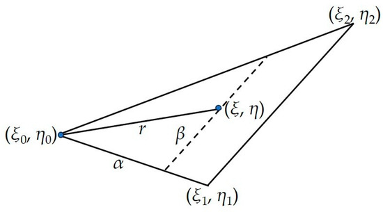 In this section, the (α, β) transformation proposed by Zhang et al. [35], akin to the polar coordinate transformation, is initially introduced. As illustrated in Figure 3, the sub-triangular element is mapped to a unit quadrilateral using the (α, β) transformation, wherein the source point (x0, y0) corresponds to the line where β = 1.