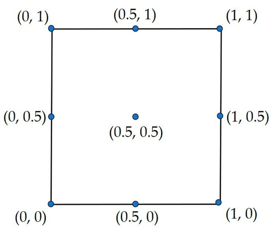 With different time step sizes and Gaussian points, the impact on Gaussian quadrature is considered in this example. The integration element, as shown in Figure 5, with vertex coordinates (1, 1), (0, 1), (0, 0), and (1, 0), is used. The relative errors for the domain integral in (15) are illustrated in Table 1. τ is the size of the time step. The equation 5 × 5 denotes the Gaussian points used in Gaussian quadrature.