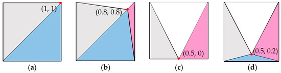 The subdivision of the quadrilateral element when the source point is located at (a) (1, 1), (b) (0.8, 0.8), (c) (0.5, 0), and (d) (0.5, 0.2), respectively.