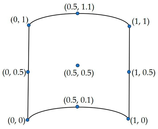The integral is performed using the curved quadrilateral depicted in Figure 8, with the coordinate of the source point set at (0.5, 0.5). The relative errors of various methods at different time steps are compared in Table 8. ‘Direct’ indicates that Gaussian quadrature is applied directly. ‘Polar’ refers to the polar coordinate transformation. ‘Sinh’ and ‘Distance’ present the sinh transformation and the new distance transformation. ‘αβDistance’ denotes the (α, β) distance transformation. The 20 × 20 Gaussian points are used in all methods.