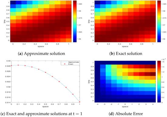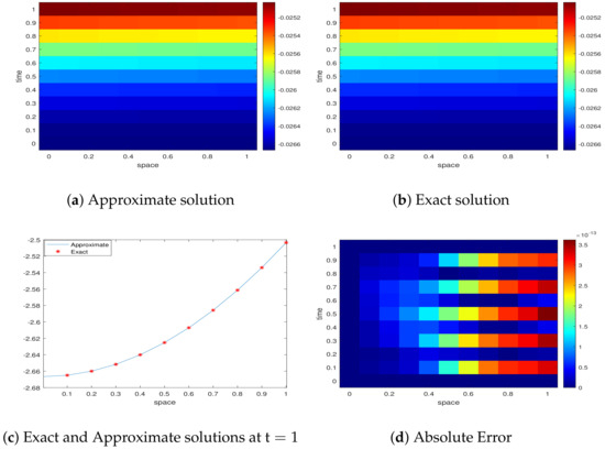 The exact solution is . For , the absolute error norm is given in Table 5 and Table 6, respectively. In Table 5, the values of the proposed scheme in comparison with VIM are given for temporal step size , which demonstrates that the proposed methodology exhibits improved accuracy. In Table 6, our results are compared with the RBF method. The results from QBS are superior to those indicated in [33] at final time . Moreover, at the larger time, the proposed method attains good accuracy. In this case, the temporal step size is and the collocation points are . The heat map profiles of the absolute error, exact and approximate solutions along with the plot of the exact vs. approximate solution plot at are give in Figure 3, which shows that the QBS results correspond to the exact solution. Table 7 shows the convergence rate and spectral radius values along with the computational time. Furthermore, the error norm and computational time show that the proposed method results are better than [33].