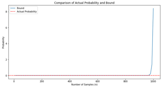 The culmination of our numerical illustration is visualized through a line plot. This plot showcases the theoretical bound alongside the actual probability for different sample sizes, offering a visual comparison of the concentration behavior in Figure 5 below.