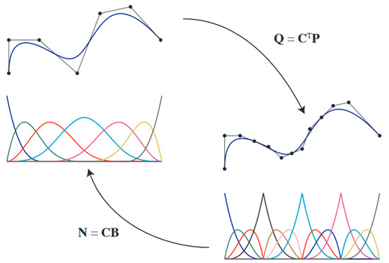 See [31] for a Bézier extraction diagram of the B-Spline curve. The basic capabilities and control points of the B-Spline are denoted as N and P, respectively. The Bernstein polynomial and the control points are denoted as B and Q, respectively.