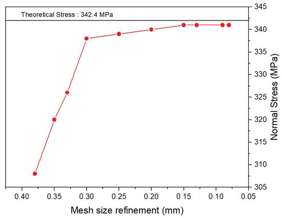 To ensure a robust convergence of results in Abaqus/CAE and facilitate pertinent comparisons with the IGA approach based on the NURBS and T-Spline results, we performed a mesh convergence study for the proposed refinements. We established that a mesh size ranging from 0.15 mm to 0.09 mm for the calculation of stress is robust and consistent (Figure 4). Additionally, for an efficient computation time ratio, we used a mesh size of 0.15 mm for this investigation.