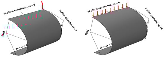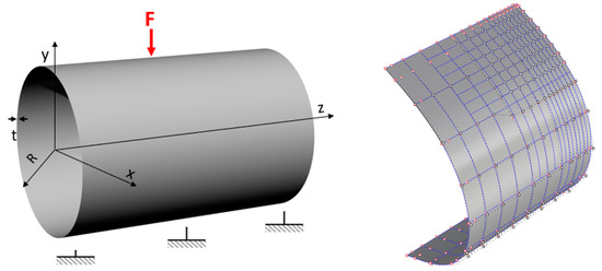 Considering geometric symmetry and to enable an efficient computation time ratio, we used half of a 3D cylindrical shell pipe (Figure 6) to model the impact for both numerical investigation methods, the finite element method (FEM) according to Abaqus/CAE and the IGA approach based on NURBSs and T-Splines.