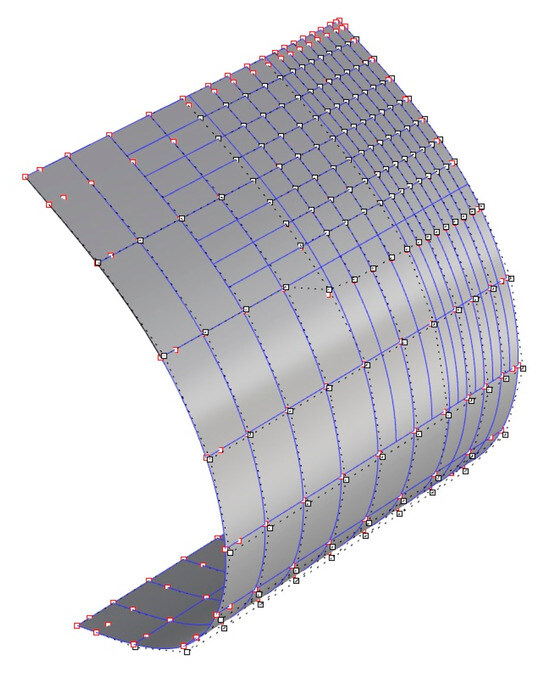IGA based on NUBRSs is limited to the evaluation of trimmed surfaces; it requires specific adjustments in terms of the interpolation domain, especially the B-Spline or NUBRS interpolation functions in order to consider the trimmed geometry [18]. Alternatively, MultiPatch specifically relies on Kirchhoff–Love shell theory for trimmed surfaces, as outlined by Reichle et al. [19]. The isogeometric analysis approach based on the use of T-Splines is designed to mitigate the limitations of NURBSs. T-Splines provide a high level of flexibility in 3D surface shaping, and they are often used in conjunction with subdivision surfaces. This combination allows for the creation of highly detailed models with smooth surfaces.