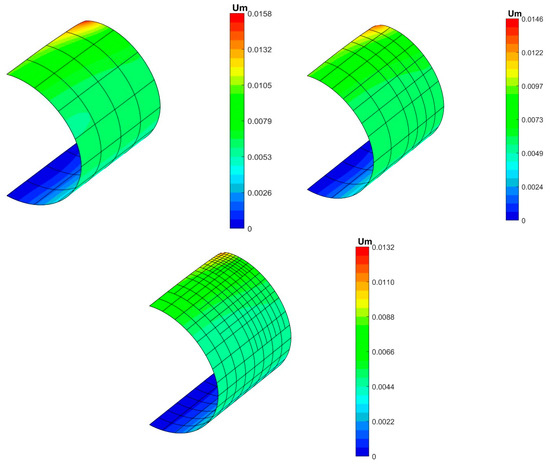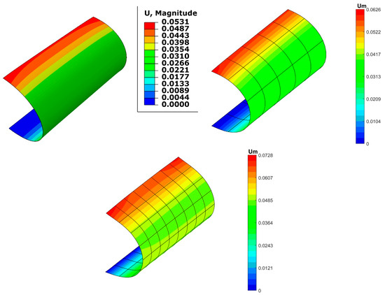 Further, we performed a comparative study using a T-Spline for comparison and validation with results found in the literature, especially those relating to the use of the NURBS IGA and FEM Abaqus/CAE methods (Figure 19). The amount of displacement calculated using the T-Spline method is 0.0728 mm, which is slightly higher than that found when using IGA NURBSs and FEM Abaqus at 0.0531 mm and 0.0626 mm, respectively. Note that in T-Splines with 361 control points, the maximum displacement per cylinder is reduced to 0.0693 mm. We conclude from all these results that we are confident in using the T-Spline method as an alternative method to investigate the mechanical performance of cylindrical shell structures.