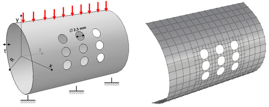 In this section, we evaluated a 3D cylindrical shell pipe with a preformed hole under a compressive load (Figure 20) in relation to structural engineering problems. The objective is to evaluate the efficiency and robustness of the T-Spline method in the field of trimmed surfaces. In this study, we compared the results found when using the T-Spline method with the Abaqus/CAE finite element method because IGA based on NUBRSs is too limited for the evaluation of the trimmed surfaces; it requires a specific adjustment of the interpolation domain, especially the B-Spline or NUBRS interpolation functions, when considering a trimmed geometry. A 3D cylindrical shell pipe (r = 300 mm; L = 600 mm; thickness = 3 mm) with nine holes with a 2.5 mm diameter was evaluated with the objective of assessing the mechanical robustness and structural integrity of pipes with preformed holes in cases of severe mechanical and chemical damage. This recent investigation completes the research conducted in [36,37,38].