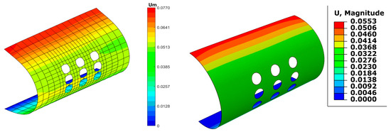 In Figure 21, we compare the numerical results of the displacement between the T-Spline and FEM Abaqus methods, and in noting that the NURBS IGA method is very limited in terms of studying trimmed surfaces, it was not considered for comparison in this study. The maximum displacement value was found to be higher than the FEM Abaqus displacement value , and we concluded that, in the case of preformed holes, the displacement value increased by ; this suggests the performance degradation of a cylindrical shell pipe with preformed holes, leading to integrity issues.