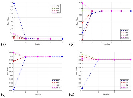 To showcase the efficiency of our proposed scheme, we offer the comparative study with classical methods such as Newton’s method (NM) [43], Abbasbandy’s method (AM) [44], Halley’s method (HM) [43], and Chun’s method (CM) [45]. To proceed further, we consider the following non-linear equations: