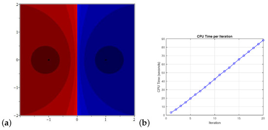 Here, we briefly describe Equation (4) through the basin of attraction and some illustrations corresponding to CPU time to generate the basin of attractions (Figure 7, Figure 8 and Figure 9). We deploy our proposed Algorithm on with a points grid by fixing the tolerance , and the maximum number of iterations is 20. For this purpose, we consider the extensively known problem . We take only .