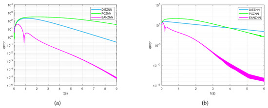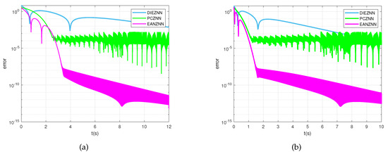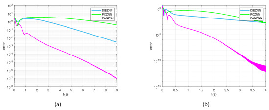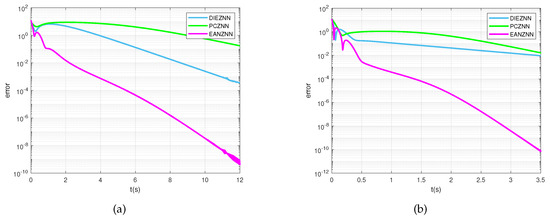 Under the condition of linear noise (), the error norm () for the TVMI of the matrix equation (29) is computed using PCZNN, DIEZNN, and EANZNN. (a) ; (b) .