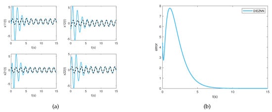 Figure 3a displays the state solution, while Figure 3b illustrates the error norm for PCZNN. From Figure 3a, it can be visually observed that under linear noise conditions (), PCZNN converges to zero in approximately 12 s. Figure 4a and Figure 4b show the state solution and error norm of DIEZNN, respectively. It can be observed from Figure 4b that DIEZNN converges to zero in approximately 15 s and remains stable under this linear noise.