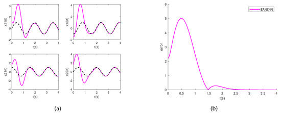 Simulation results of solving the TVMI problem for matrix Equation (28) using EANZNN with under conditions of linear noise (). (a) State ; (b) Error norm .