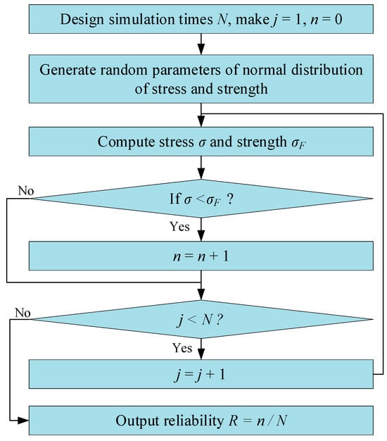 The residual strength of the gear can be determined using Equations (25) and (26). Based on actual experimental tests on the gear, it is found that the stress follows a log-normal distribution. With the residual strength and stress distribution taken into account, the dynamic reliability analysis can be conducted. According to the obtained residual strength and dynamic stress, the reliability can be calculated using the Monte Carlo simulation method. The flowchart of the Monte Carlo simulation method is shown in Figure 2.