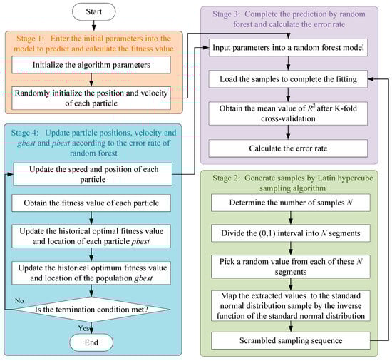 When analyzing reliability using the Monte Carlo simulation method, the calculation accuracy heavily relies on the number of simulations. However, conducting a large number of simulations can significantly decrease efficiency. To address this problem, a surrogate model is established. While a random forest model exhibits better generalization performance and robustness compared to a single decision tree, optimizing its hyperparameters may enhance its predictive performance. In this study, the particle swarm optimization algorithm is employed to optimize the hyperparameters of the random forest model. The particle swarm optimization algorithm is an efficient and easy-to-implement global optimization algorithm and can be used for hyperparameter optimization in machine learning algorithms []. The flowchart of the PSO-RF algorithm is shown in Figure 3.