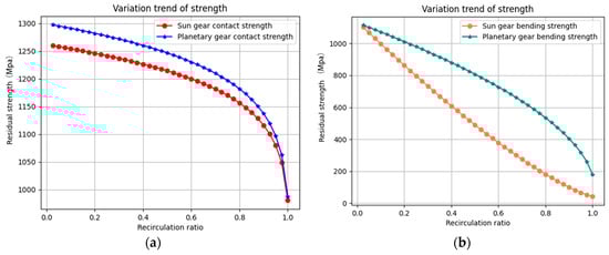 Figure 9 is the degradation process of tooth contact and bending fatigue strength. The contact fatigue strength of the sun gear degrades faster than that of the planetary gear (see Figure 9a), while the bending fatigue strength shows the opposite trend (see Figure 9b). The gear strength exhibits steady degradation in the early and middle stages, followed by rapid degradation in the final stage, which is consistent with the characteristic of “sudden death” in metal materials.