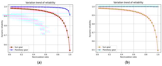 As shown in Figure 10, the reliability of the system decreases slowly in the early stage of operation and rapidly in the later stage. The planetary gears have relatively high reliability and maintain stability before and after operation. Due to the high rotation speed of the sun gear and the large number of load cycles it experiences, the reliability of the sun gear is relatively low. This indicates that the sun gear is a weak link in the transmission system and should be given special attention during the design process.