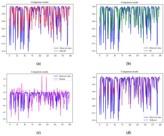 Figure 12 presents the comparison results of four different surrogate models, with the blue curve representing the observed values. Figure 12a–d show the fitting results of the PSO-RF model, random forest model, Kriging model, and XGBoost model, respectively. It can be observed that the results of the PSO-RF model are the closest match to the observed values.