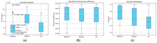 Figure 13 presents box plots of the three algorithms in terms of volume, transmission efficiency, and reliability metrics. Please refer to Figure 13a to understand the box diagram. Regarding the volume metric, the AMOEA/D algorithm exhibits a lower median position (see Figure 13a), indicating that the overall solutions obtained are significantly superior to those of the DE algorithm and MOEA/D algorithm. In terms of transmission efficiency, the AMOEA/D algorithm achieves the highest median value (see Figure 13b), indicating the overall optimality of the solutions obtained, followed by the DE algorithm and then the MOEA/D algorithm. In the case of reliability, the AMOEA/D algorithm demonstrates a clear advantage, as the obtained reliability is closest to 1 (see Figure 13a). The MOEA/D algorithm ranks second, while the DE algorithm performs the poorest.