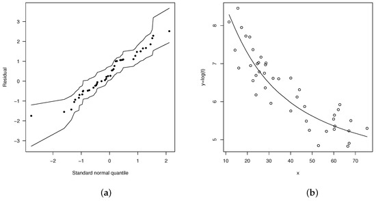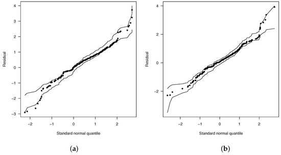 Normal probability plots for with envelopes of Q-qplots for the scaled residuals for the fitted models: (a) nonlinear log-BS model and (b) nonlinear log-FBS model.