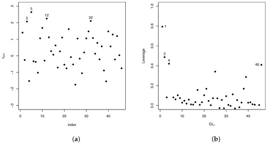 (a) Plots of deviance component residuals . (b) Elements in the diagonal of the generalized Leverage matrix .