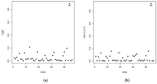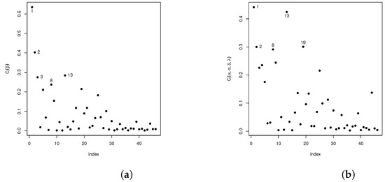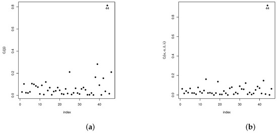 Plots for the index in the case-weights scheme: (a) for and (b) for .
