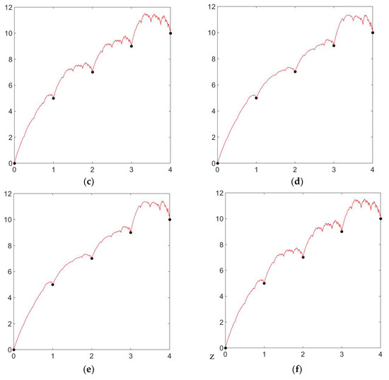To verify the diversity and flexibility of the zipper-rational cubic fractal interpolation function compared to the rational cubic fractal interpolation function, we provide an example considering the interpolating points . Throughout Figure 2, the shape parameter is considered . In Figure 2a, we have taken the scaling factor and signature as , and in Figure 2b, the signature as and scaling factor as . Comparing Figure 2a,b, Figure 2a is less detailed, whereas Figure 2b is more is more detailed and dense due to the increased scaling factor. Since we have taken the signature as , these figures are the same as Figure 1a and Figure 1b. Comparing Figure 2b,c, we have taken the same scaling factor as for both figures and the signature as and , respectively, Figure 2c is more detailed or enhanced as it is producing a negative graph due to the change in signature value. Figure 2d,e can be compared as we have taken the same scaling factor in both figures and signature as and , respectively. Comparing Figure 2e with scaling factor and signature as to Figure 2f with scaling factor and signature as , Figure 2f is more detailed compared to Figure 2e, which is due to the increase in the scaling factor.