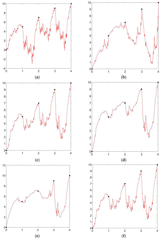 Figure 3a, we have taken the shape parameter, i.e., and the scaling factor . The corresponding graph is positive. In Figure 3b and Figure 3c, we used the same shape parameter, i.e., but different scaling factors and , respectively. We can easily witness the change in shape due to the different vertical scaling factors. In Figure 3d and Figure 3e, we used the same scaling factor, i.e., but different shape parameters, which are and , respectively. The change in the graph of the positive rational cubic fractal interpolation function is due to the different values for signature and shape parameters. Similarly, by taking the shape parameter and scaling factor, , Figure 3f is generated, which is another positive graph for the rational cubic fractal interpolation function.