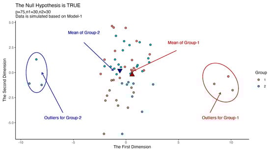 We draw a plot to show the effect of outliers in Figure 1. We generate 27 random observations from the first population and 27 observations from the second population such that . Moreover, we generate three random observations for the first group from the population , and three observations for the second group from the population . is generated based on Model-1 in each case in Figure 1. Also, and . We used the multidimensional scaling method to reduce the dimension from 25 to 2.