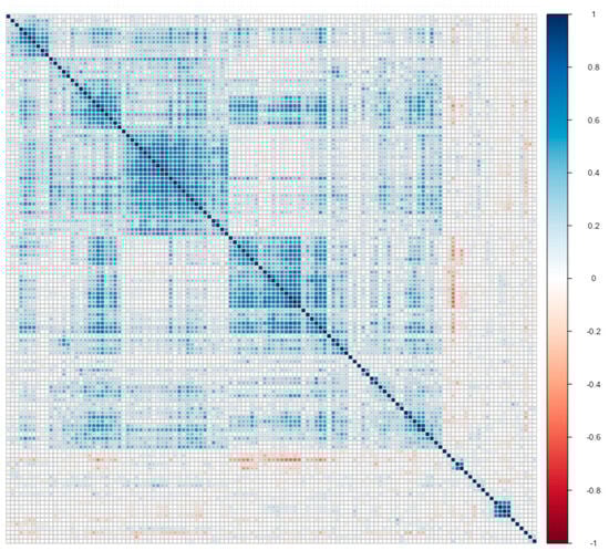 In this subsection, we use only 124 protein measurements as biomarkers of AD. Therefore, we have variables in our data. Moreover, we use a subset that contains 106 high-risk patients with Apolipoprotein E genotype E3E4, as Wang, Lin and Tang [] do. subjects of them are “impaired”, and subjects of them are “healthy”. Then, we standardized all variables. As a result, we have high-dimensional data, and we provide a correlation plot of this data in Figure 2.