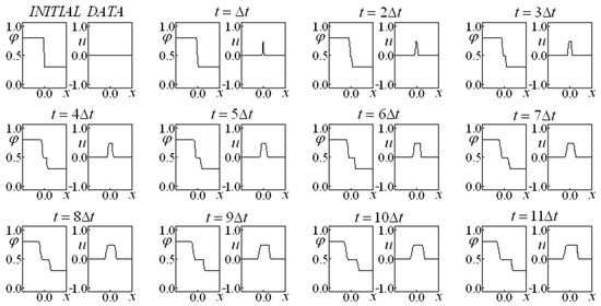 All the pictures in this section use a structure presenting the initial data for saturation and velocity in the first graph on the upper left side. The subsequent time instants march from left to right, following the first line of graphs and, subsequently, the second, third, and fourth (when present) ones, as indicated. The horizontal axis represents the coordinate on the flow direction x, varying from to , while the vertical axis represents both the saturation and the velocity .