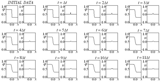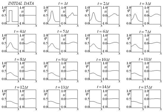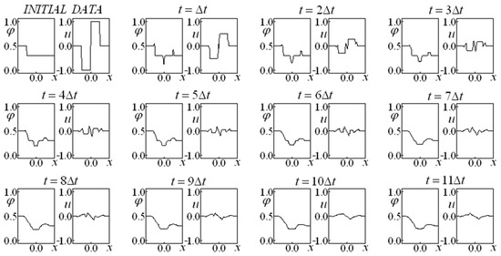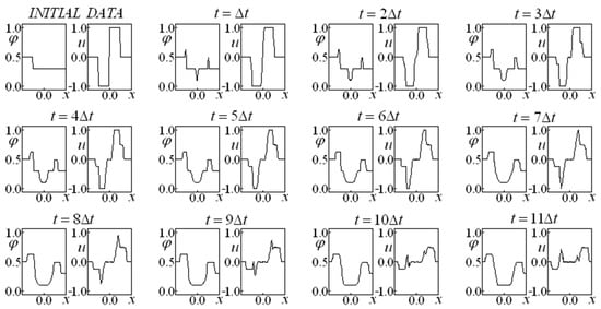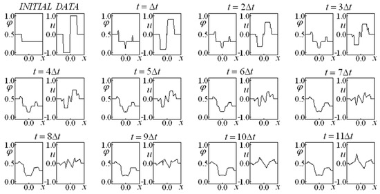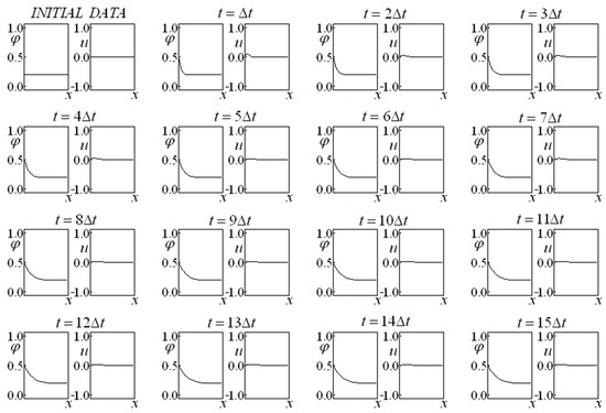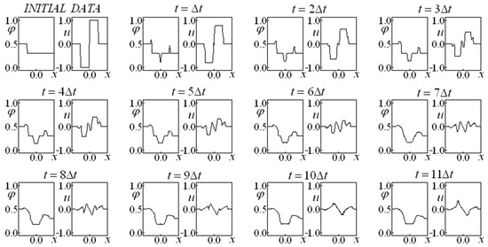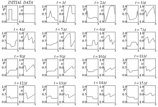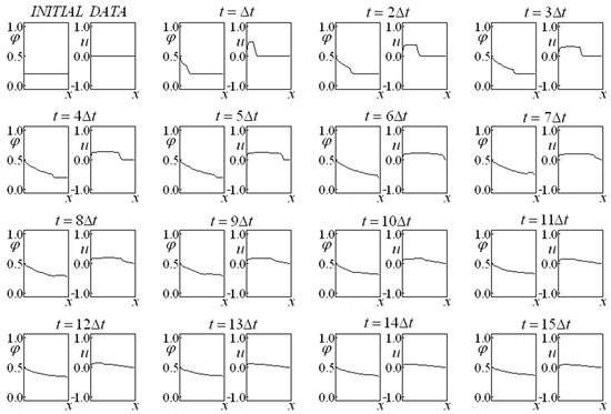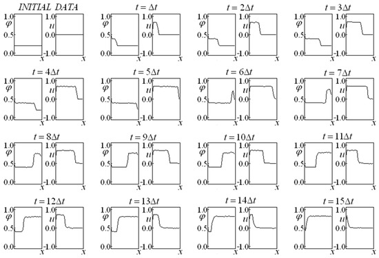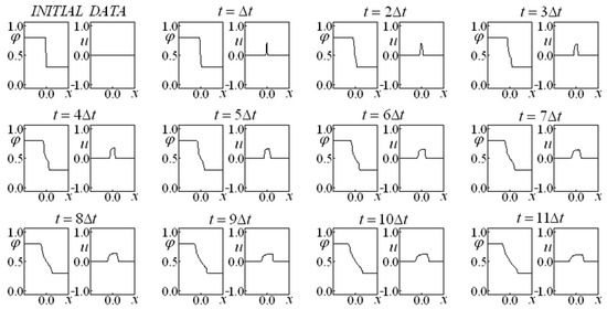 First, Glimm’s method is employed in Equations (14) and (15), allowing for us to obtain a preliminary approximation of the variables and (making an analogy with the predictor–corrector method, this would be the prediction step). A variant of the classic Glimm’s method is implemented in which four completely independent time-advance procedures (each one endowed with its own random choice) originate a result corresponding to the average of these four evolutions at each instant. These four sequences were employed independently, while the results were obtained from an arithmetic mean of the results of each sequence. This fact promoted a more accurate result, even for the first advance. It is remarkable that, in subsequent time instants, the evolution considers the results that originated it instead of considering the average of the results.