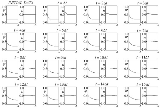 Figure 4, Figure 5, Figure 6, Figure 7, Figure 8 and Figure 9 present results obtained with initial data involving a nonzero velocity for several values of the parameters and . Their initial data (data set two) imposes a step function for saturation and two distinct step functions for the velocity. Figure 4 represents the case in which there are no drag forces, while the other cases are affected by the drag presence. It may be noted that the higher the drag terms coefficients, the higher the “smoothing” effect on the saturation and velocity along the time.