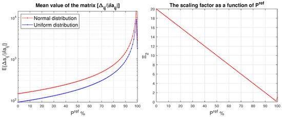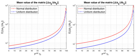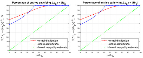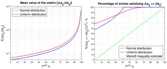 Theorem 1 allows the decrease of the mean value of the bound, , and hence the magnitude of its entries by the quantity , choosing the desired probability, , less than 1. The value corresponds to the case of the deterministic bound, , with entries , when it is fulfilled that all entries of are larger than or equal to the corresponding entries of the perturbation, . The value corresponds to , where . As mentioned above, the probability bound produced by the Markoff inequality is very conservative, with the actual results being much better than the results predicted by the probability, . This is due to the fact that the Markoff inequality is valid for the worst possible distribution of the random variable .