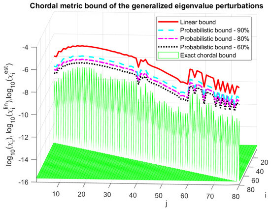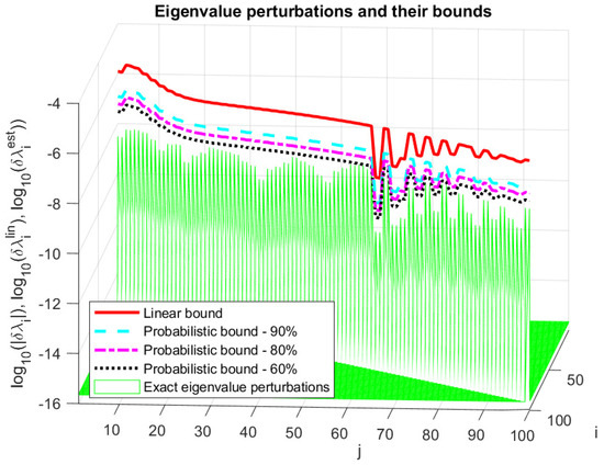 Using Theorem 3, the probabilistic perturbation bounds of x and in the case of the Schur decomposition can be found from (29) and (31), respectively, replacing in (29) the perturbation norm by the quantity , where is determined according to (3) from the desired probability, , and the problem order, n. In this way, we obtain the probabilistic asymptotic estimate