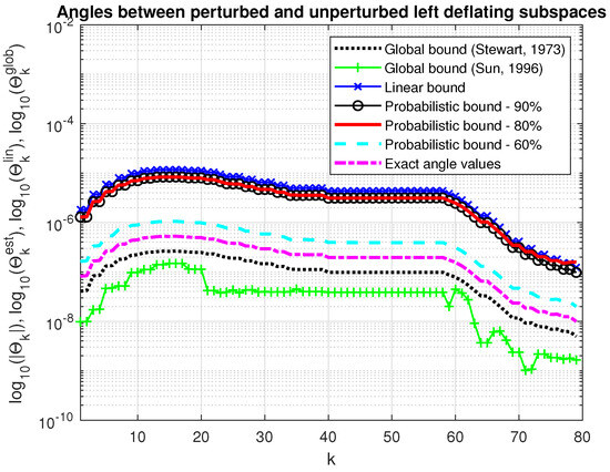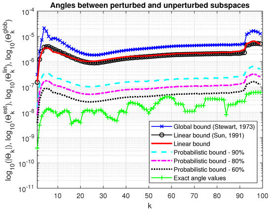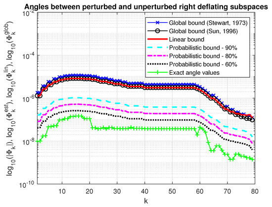 The implementation of Theorem 5 to estimate the sensitivity of an invariant subspace shows that the bound (23) tends to overestimate severely the true value of the angle for and large n. In practice, it is possible to obtain reasonable results if we use only the first-order term () in the expansion (23), i.e., if we use the linear bound