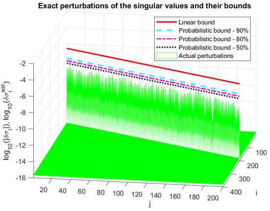 which produces very pessimistic results for a large m and n. To reduce , in [29] it is proposed to decrease the entries of , taking a bound with entries , where . Of course, in the general case, such a bound will not satisfy (1) for all i and j. However, we can allow to exist some entries, , of the perturbation that exceed in magnitude, with some prescribed probability, the corresponding bound, . This probability can be determined by the Markoff inequality ([37], Section 5-4)