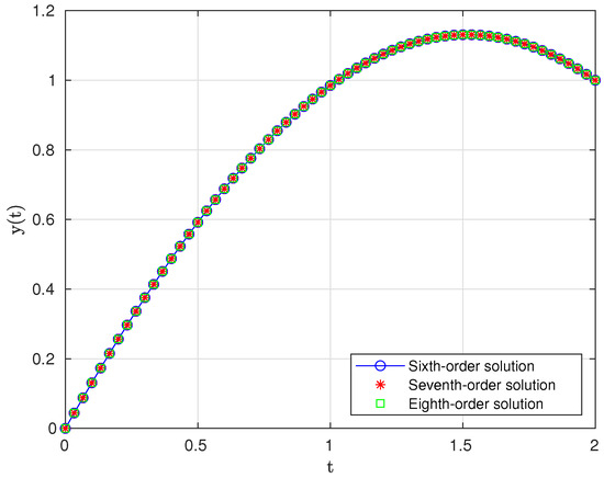 Next, we converted the problem of solving the integral equation into a system of nonlinear equations using the Gauss–Legendre quadrature formula given in [25]. We solved the obtained system using the method (3) with as in (18)–(20) with the initial point . The results obtained in each iteration are shown in Table 1, from which it is visible that the method (3) with as in (18)–(20) are converging to within the second iteration. Hence, the results in Theorem 1 are validated for this example.