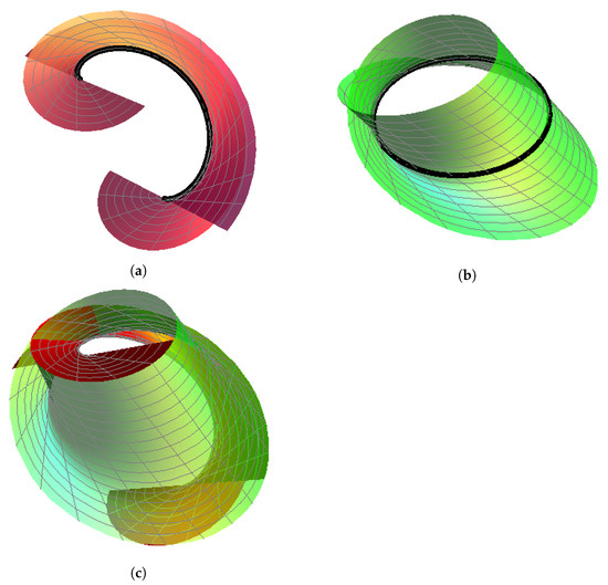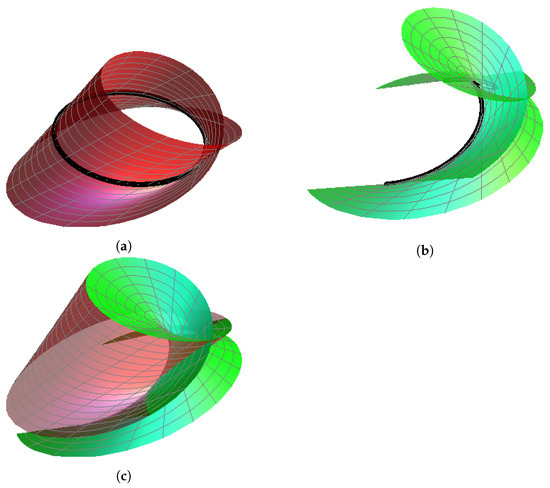 The -spatial quaternionic partner-ruled surfaces for and . (a) and its striction curve (black). (b) and its striction curve (black). (c) The surfaces (red) and (green).