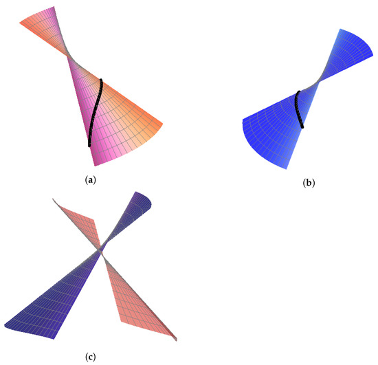 -spatial quaternionic partner-ruled surfaces for and . (a) and its striction curve (black). (b) and its striction curve (black). (c) The surfaces (red) and (blue).