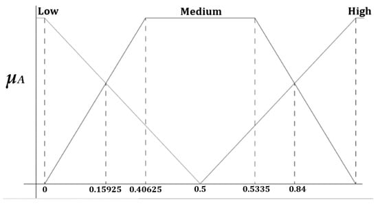 Agent-based technologies are generally used in our everyday communication. Discrete values should be used to build intelligent agents. We plan to turn discrete values into conditions of linguistic phrases based on fuzzy logic by feeding information to a discretized with outputs from the intelligent malware detection e-service (a standard fuzzy space of three sets: LOW, MEDIUM, and HIGH). The linguistic phrase is measured using an appropriate function [16,17]. The form of the membership function is important in fuzzy-based systems because it affects the system overall. Different shapes are possible, like triangular, trapezoidal, Gaussian, etc. The triangular shape was used in our situation. The triangular membership function is determined by three parameters {a, b, c} using minimum and maximum in the following way: