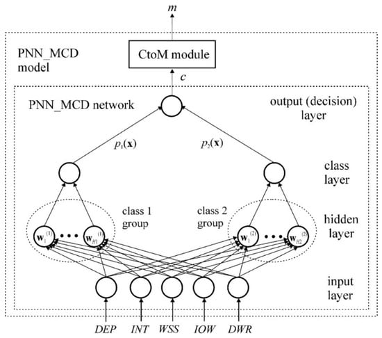 The input layer of the PNN-MCD network (buffer layer) forwards the values of the input vector x to each neuron in the hidden layer. The number of neurons in the input layer, M, is equal to the number of input variables, i.e., equal to the size of the vector x, M = 5.