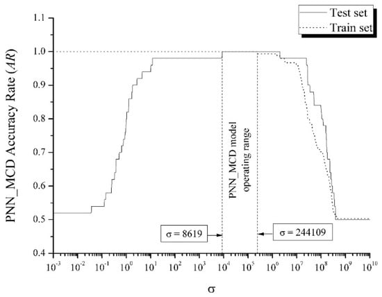 To estimate the accuracy of the presented PNN-MCD model, we investigate the dependence of the PNN-MCD model accuracy rate (AR) on the spread parameter (σ). The spread parameter is changed in a wide range . The results obtained for the train and test set are shown in Figure 3. The PNN-MCD neural network training with the spread parameter values in the range 8619 ≤ σ ≤ 244,109 provides a maximum value of AR (AR = 1, TP = 25, FP = 0, TN = 25, FN = 0) for both the training set (shown by dashed line) and the test set (solid line). In other words, the specified range of the spread parameter defines the operating range of the PNN-MCD model since the neural network training using the spread parameter from that range gives a model that shows the ideal classification for both the train and test set.