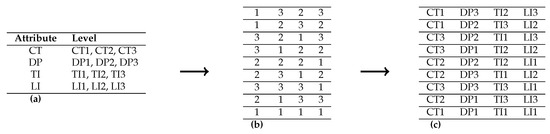 Hence, when attributes and each attribute has levels, , we repeat the analysis, but we need to generate the data first. A simulation of data is performed as follows. The arrangement of a profile is based on an OMEP by using an OA as shown in Figure 2. Figure 2a shows the basic information for each profile. The shortest possible OA (see [41]) is shown in Figure 2b.