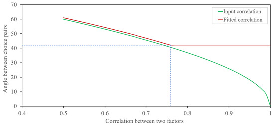 Absil et al. [36] gave the density of the largest principal angle between two random subspaces. Bar and Wells [11] used both a frequentist and Bayesian inferential procedure in their approach to detecting edges of the network. The edges depend on beta quantiles. Based on the results in [11,35,36], use as the screening rule for the frequentist approach when detecting an edge in the network diagram of vectors, where denotes the quantile of , is the angle between the pair of BW choices; and . Let us consider the scenario with and . Then, the total number of possible edges is . Let us assume we want to include an edge in the network diagram if the correlation coefficient is at least between the two vectors; that is, the angle between the corresponding pair of vectors is . Then, . Then, for to be , we can take . That is . Further, [11] presented an adjustment to the betaMix model when the n samples are not independent. In the application, we used this betaMix approach to perform classification for choice pairs based on their utility values over time.